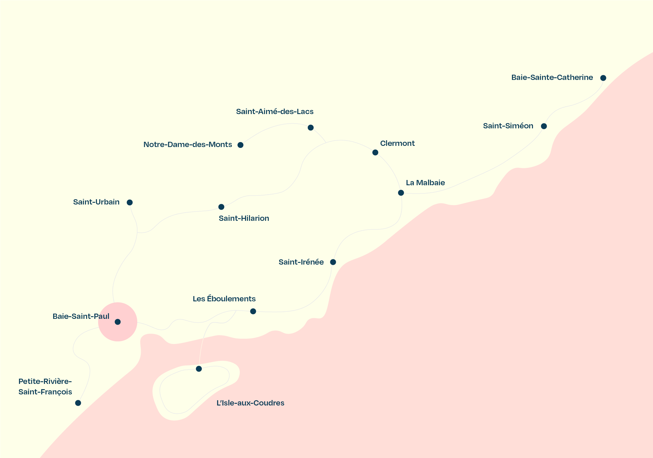 Ce service de transport collectif permet de relier toutes les municipalités d’une MRC à sa ville-centre, soit Baie Saint-Paul dans la MRC de Charlevoix et La Malbaie/Clermont.