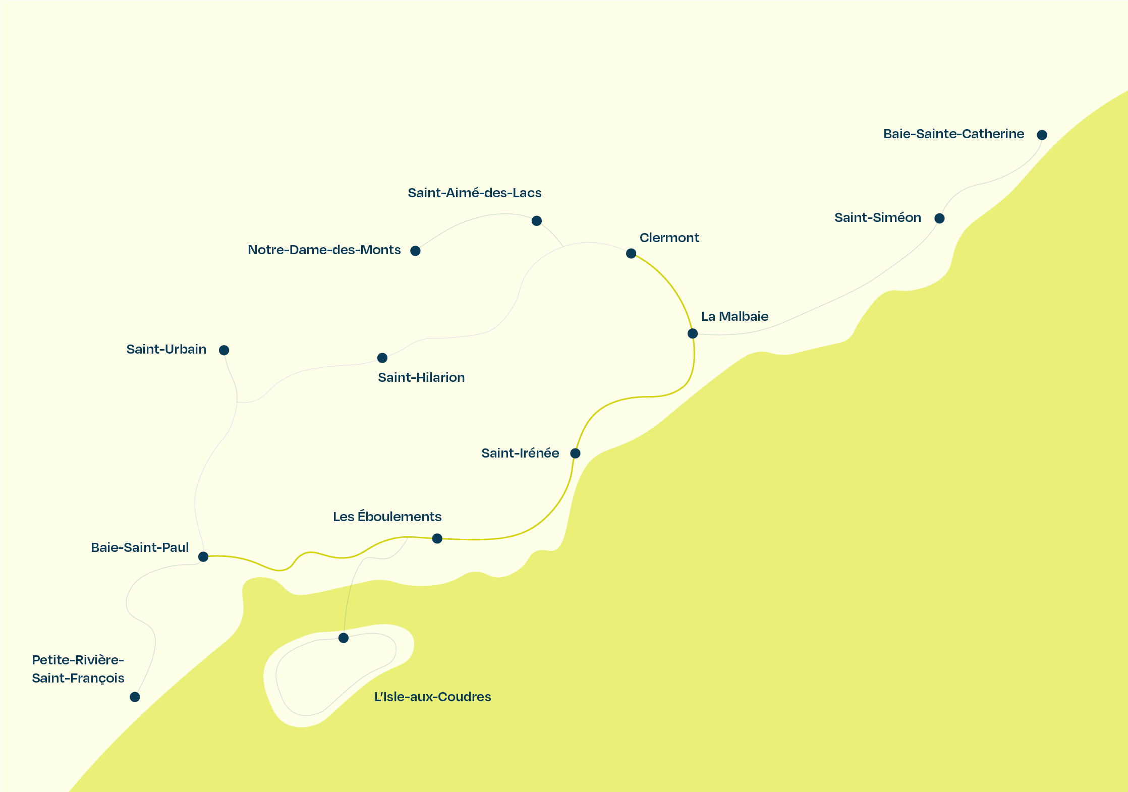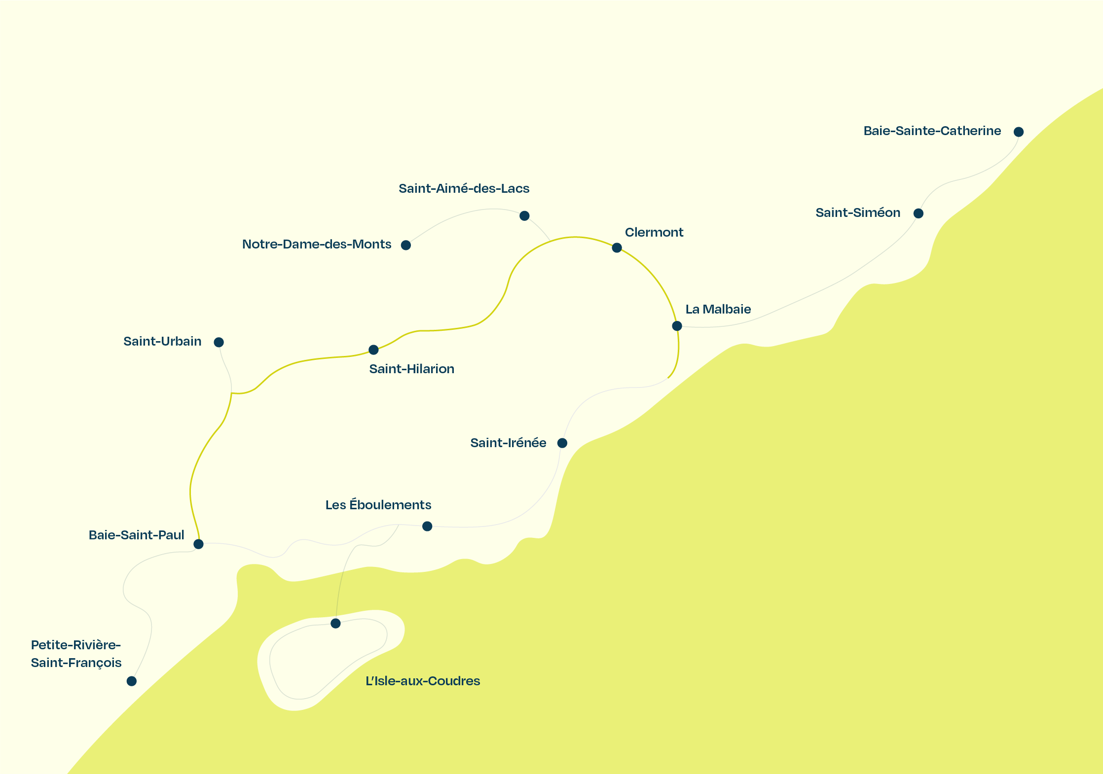 Le trajet Inter-Monts emprunte la route 138 pour relier Baie-Saint-Paul, Clermont et La Malbaie. Il dessert les municipalités situées sur ce parcours et permet de se déplacer entre les deux MRC en toute simplicité.